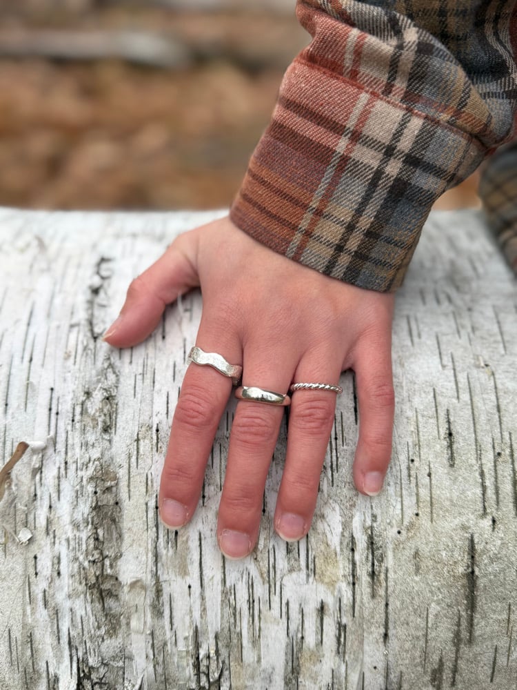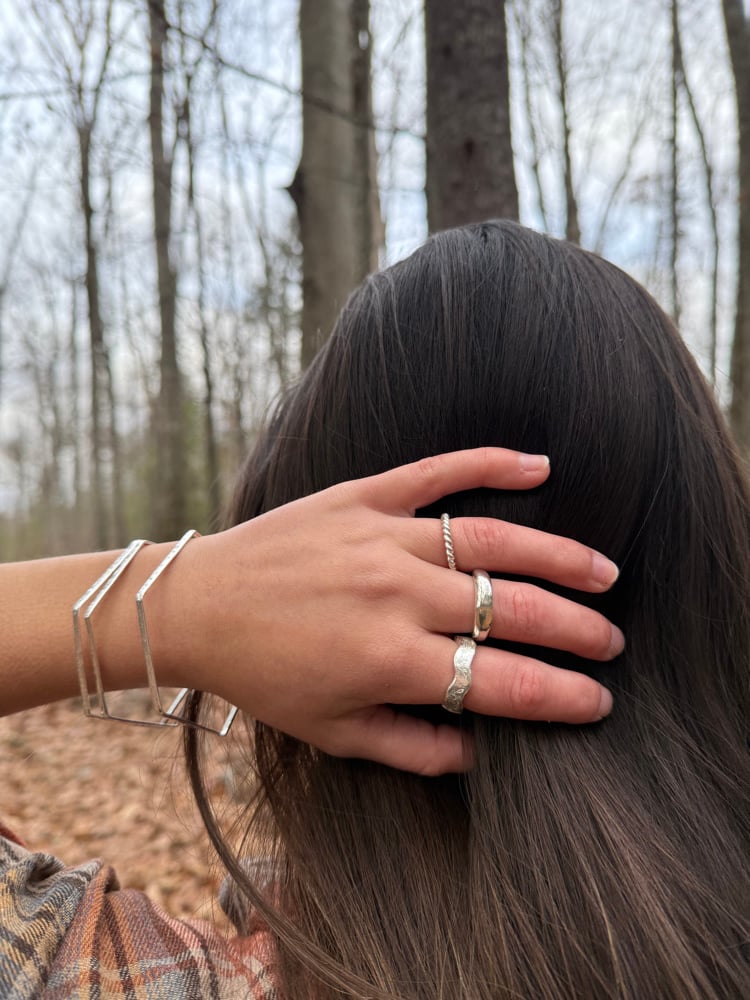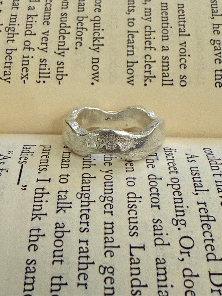 A wave shaped ring with a raw texture reflecting the ancient practice of sandcasting and makers marks. This ring has a raw and organic finish with a polish to highlight the natural texture of the piece.